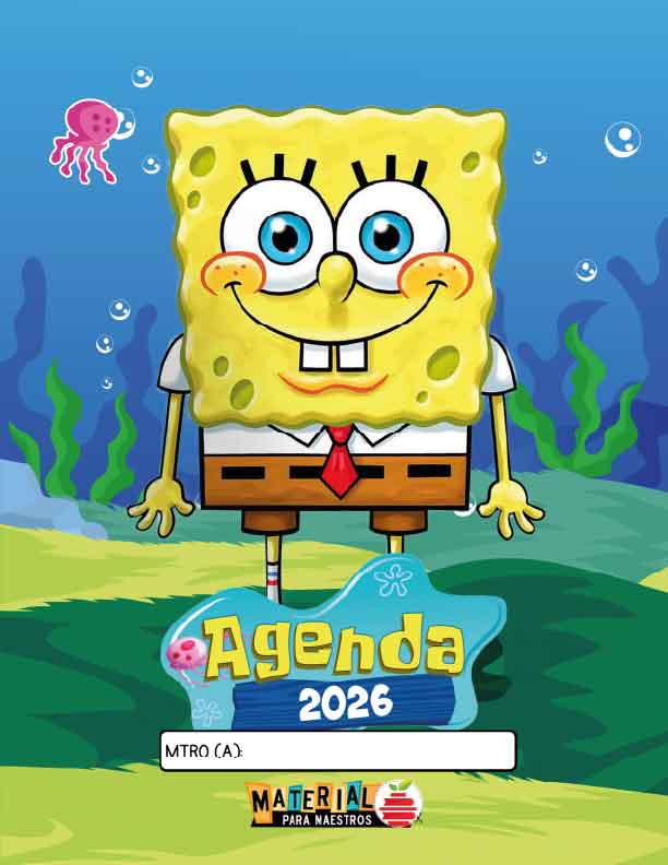 Agenda escolar 2026 de Bob Esponja, con apartados como: estadísticas, horario de clases, directorio telefónico, cumpleaños, lista de asistencia, registro de tareas y trabajos, organizador mensual, etc.