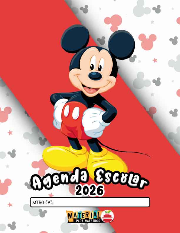 Agenda escolar 2026 de Mickey Mouse, con apartados como: estadísticas, horario de clases, directorio telefónico, cumpleaños, lista de asistencia, registro de tareas y trabajos, organizador mensual, etc.