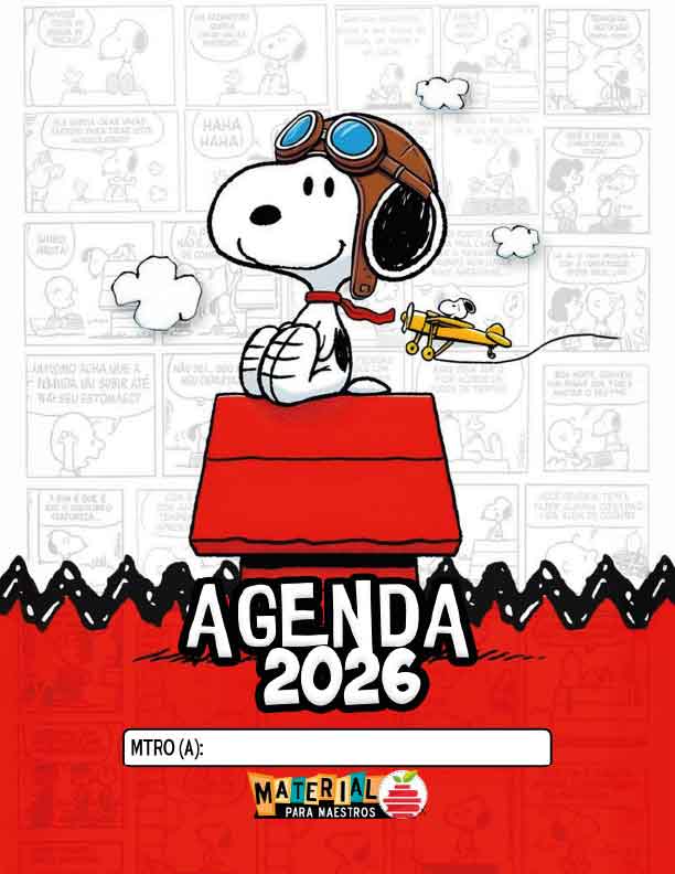 Agenda escolar 2026 de Snoopy, con apartados como: estadísticas, horario de clases, directorio telefónico, cumpleaños, lista de asistencia, registro de tareas y trabajos, organizador mensual, etc.