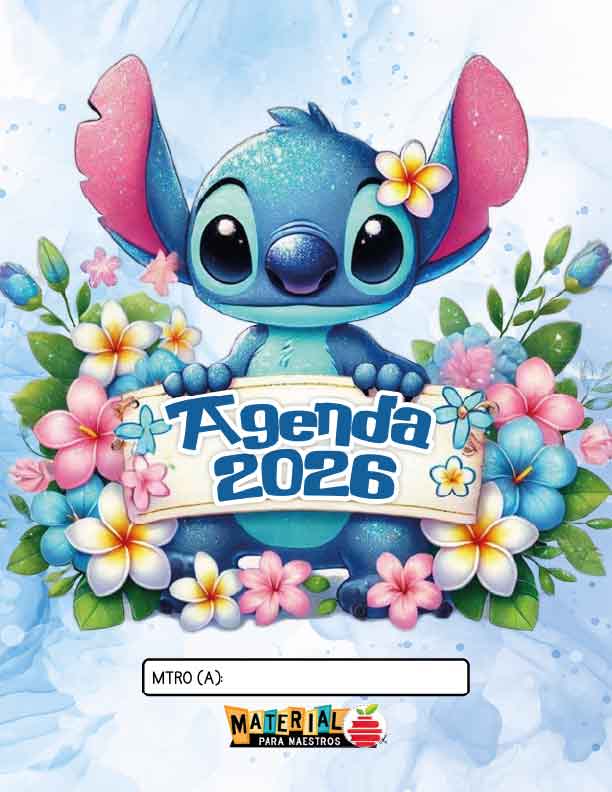 Agenda escolar 2026 de Stitch, con apartados como: estadísticas, horario de clases, directorio telefónico, cumpleaños, lista de asistencia, registro de tareas y trabajos, organizador mensual, etc.