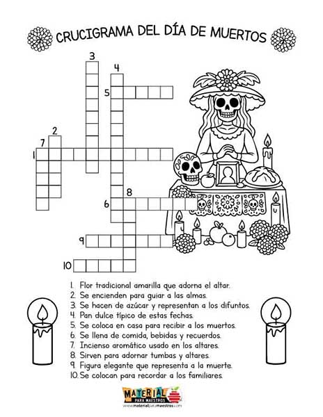 El crucigrama está diseñado para que los alumnos refuercen sus conocimientos sobre los elementos y tradiciones del Día de Muertos. A través de pistas sencillas, deberán descubrir y ubicar 10 palabras clave como cempasúchil, altar, velas, pan de muerto, catrina, entre otras.