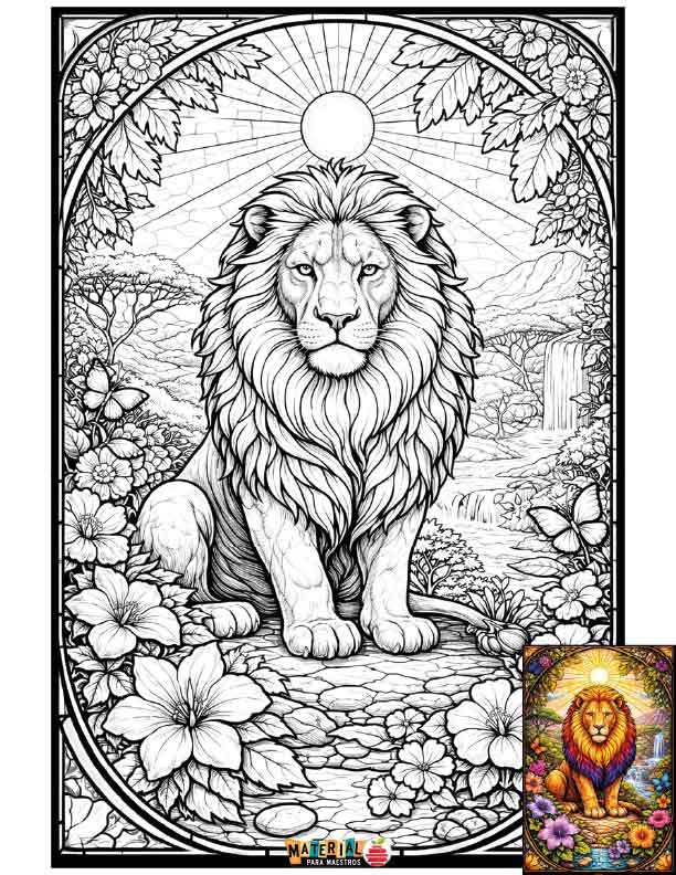 Cada página presenta un diseño simétrico y decorativo, con fondos naturales y marcos circulares o arqueados, pensados para ser coloreados en base a la imagen de refernecia.